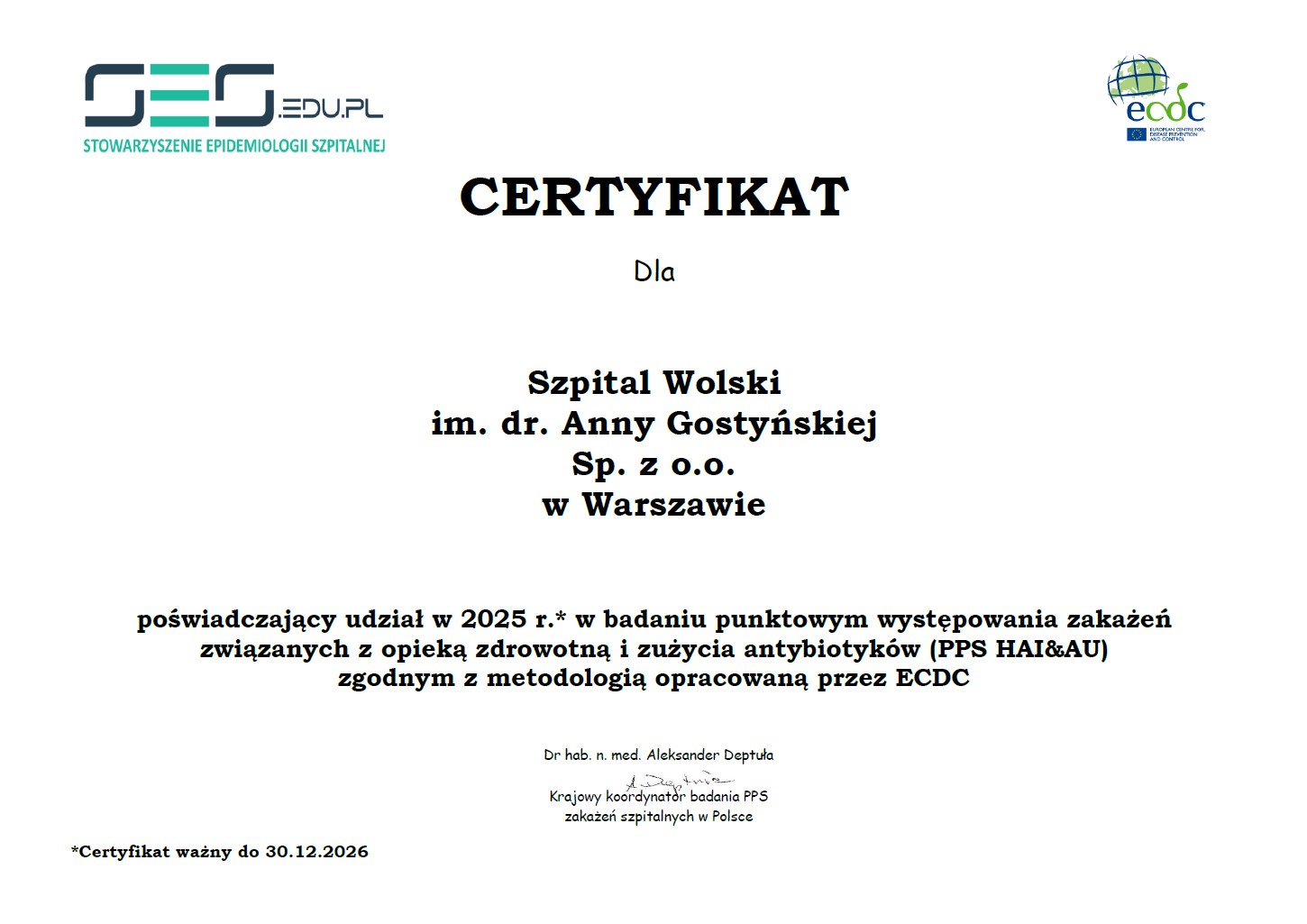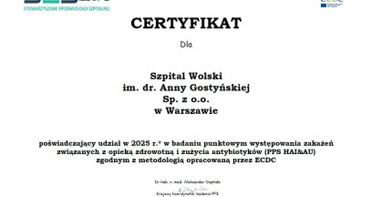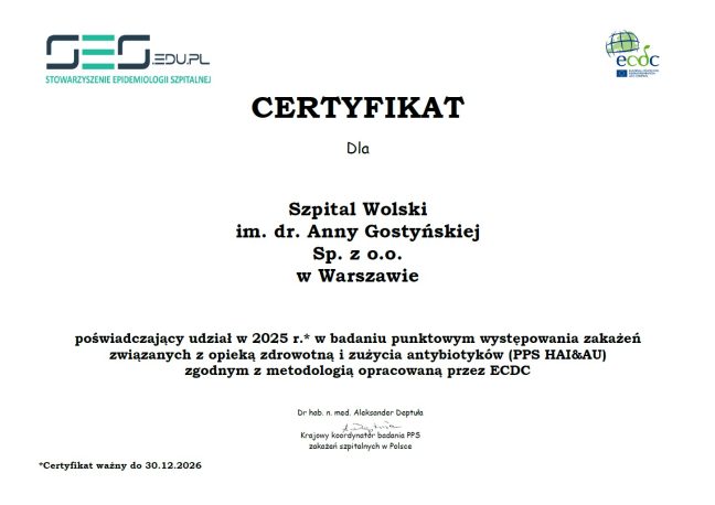 Miło nam poinformować, że SZPITAL WOLSKI im. Anny Gostyńskiej Sp. z o.o. uczestniczył po raz kolejny w Badaniu Punktowym Zakażeń Związanych z Opieką Zdrowotną i Stosowania Antybiotyków (PPS HAI&AU), zgodnym z metodologią opracowaną przez Europejskie Centrum ds. Zapobiegania i Kontroli Chorób (ECDC), uzyskując certyfikat wydany przez Stowarzyszenie Epidemiologii Szpitalnej.