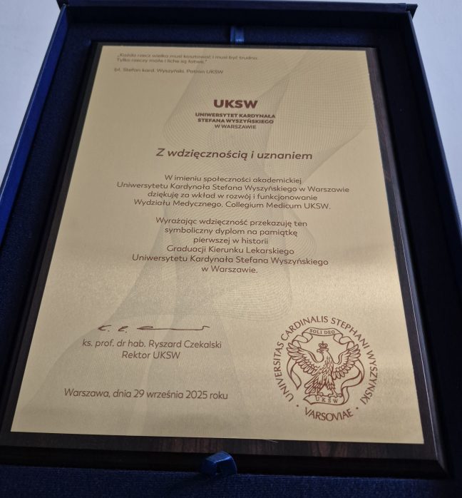 W dniu 29 września 2025 roku odbyła się pierwsza w historii Graduacja Kierunku Lekarskiego Uniwersytetu Kardynała Stefana Wyszyńskiego w Warszawie. Pierwszy rocznik absolwentów kierunku lekarskiego Wydziału Medycznego odebrał dyplomy ukończenia studiów. Graduacja odbyła się w Auli im. Roberta Schumana na kampusie UKSW. Był to bardzo uroczysty i niezwykły dzień, w którym uczestniczyli również przedstawiciele Szpitala Wolskiego im. dr Anny Gostyńskiej Prezes Robert Mazur oraz Elżbieta Lanc Członek Zarządu. Na ręce Zarządu Szpitala Wolskiego ks. prof. dr hab. Ryszard Czekalski Rektor UKSW przekazał symboliczny dyplom oraz list gratulacyjny dziękując za wkład Szpitala Wolskiego w rozwój i funkcjonowanie Wydziału Medycznego. W naszym Szpitalu studenci UKSW odbywają praktyki nabywając praktyczne umiejętności zawodu, obserwując personel medyczny jak również poszerzając zainteresowania w obrębie różnych dziedzin medycyny.
