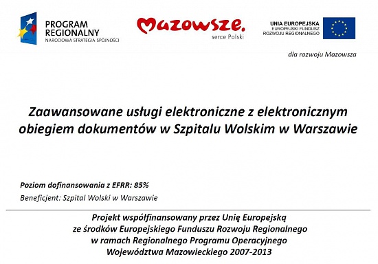 Projekt pn. „Zaawansowane usługi elektroniczne z elektronicznym obiegiem dokumentów w Szpitalu Wolskim w Warszawie” to drugi w tym roku projekt dotyczący informatyzacji, prowadzony w naszym szpitalu.